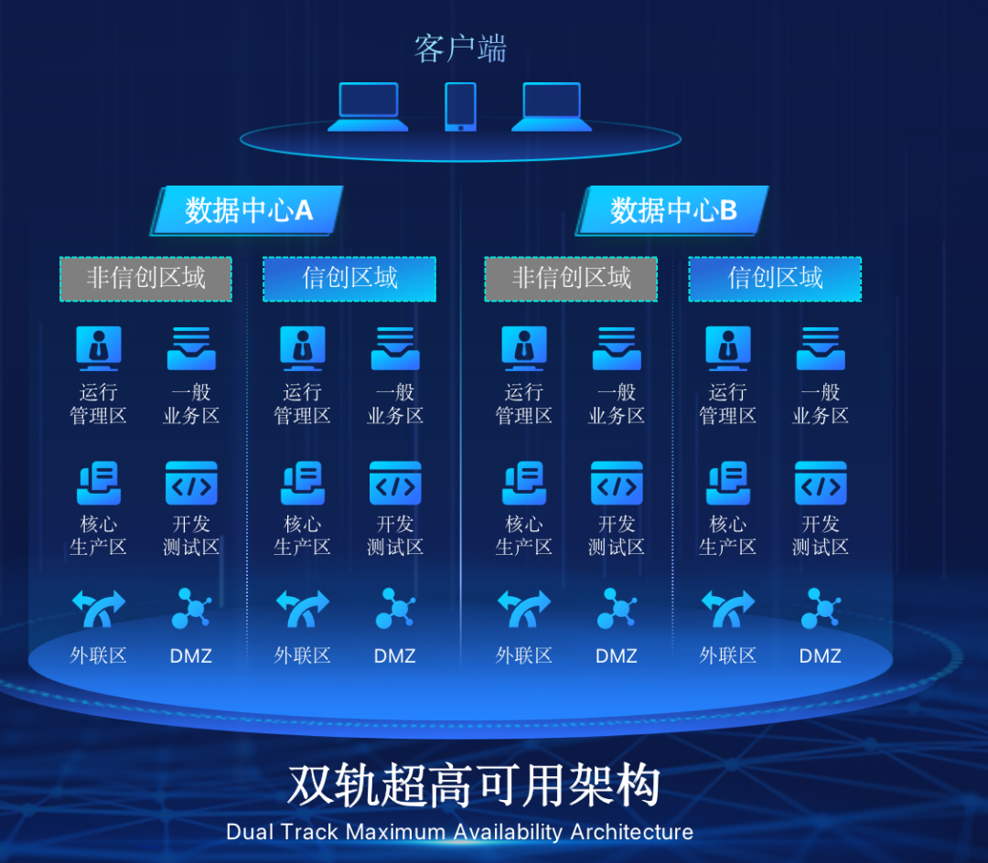 豪门国际在企业面临自主创新IT基础重构过程中,推出的全新架构双轨超高可用架构(简称DTMAA),在双活数据中心的分区调度基础上,添加每个数据中心内信创域和非信创域的分域调度,来实现分区分域协同的多活双轨超高可用。